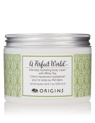 Origins A Perfect World Intensely Hydrating Body Cream With White Tea pampers skin with its rich creamy feel and a subtle natural fragrance. Highly-hydrating Shea Butter helps delete scratchy flaky dryness.