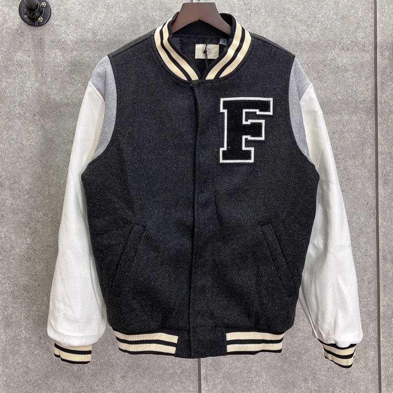 Weve got Fear of God outerwear starting at 198 and plenty of other outerwear. Mens charcoal ivory and black FOG Fear Of God wool-blend varsity jacket with striped rib knit trim throughout logo embroidery at chest dual slit pockets at sides quilted lining single slit pocket at interior and snap closures at front. Louis x v supreme jacket The teaser is filled with a variety of different colors and patterns draped across the collections shirts jackets pullovers and beaniesLondon-bred and currently Japan-based SILAS has once again enlisted the creative expertise of artist FRENCH origfear of god ebentials wool varsity jacket 14345inally joining forces in the early 2000s to create a graphic.